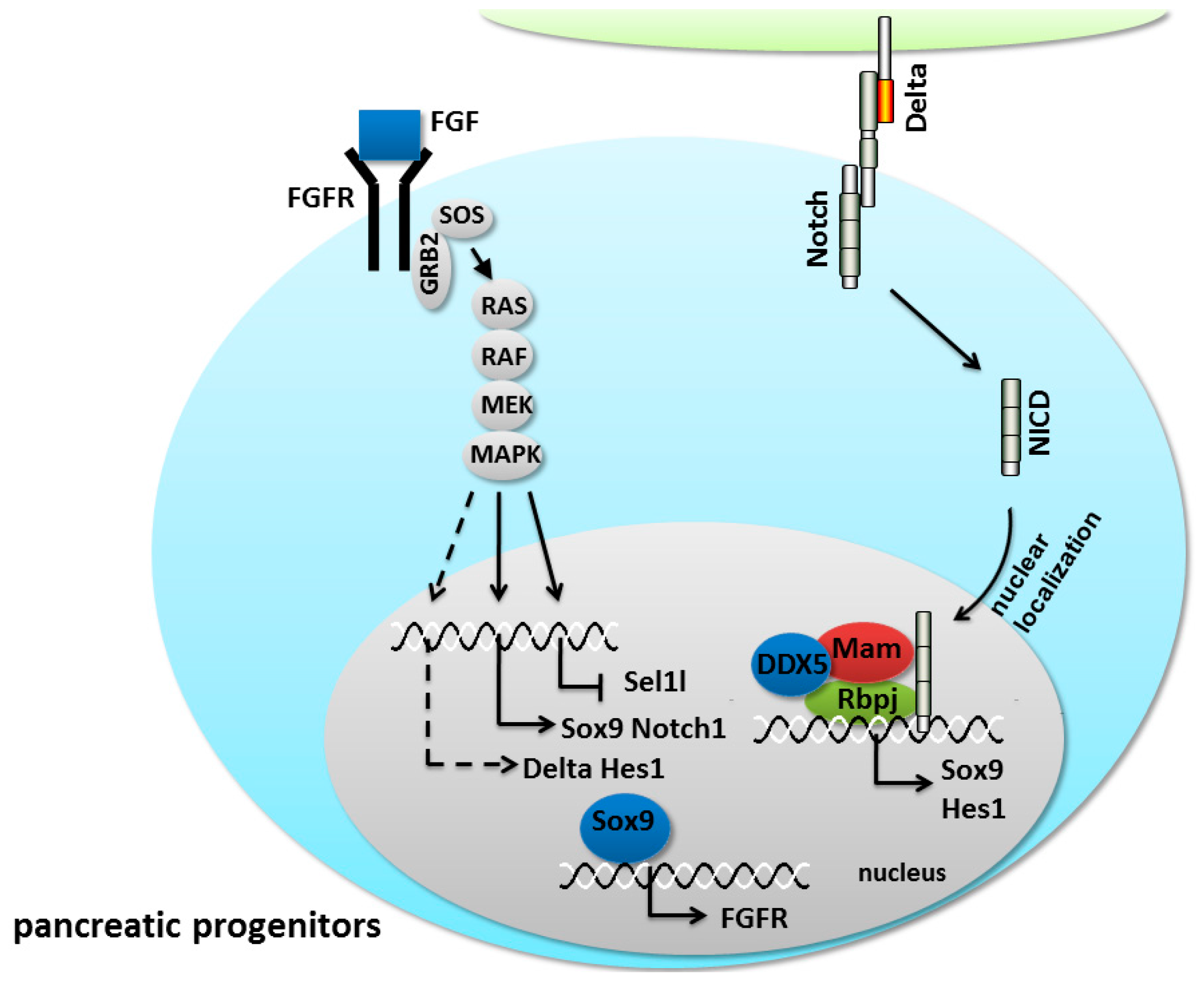 The crosstalk between the fibroblast growth factor (FGF) and Notch pathways in pancreatic progenitors. The dashed lines signify that the mechanisms existing in the pancreas are unknown. The arrows represent activation whereas bar-headed lines represent inhibition.