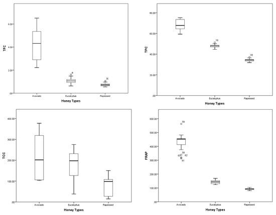Box-plot diagrams of the levels of quantitative determinations in the three monofloral honeys. TPC, total phenolic content; TFC, total flavonoid content; TCC, total carotenoids content; FRAP, ferric reducing antioxidant power assay, DPPH RSA, DPPH radical scavenging activity; O2•− RSA, superoxide anion radical scavenging activity, MICheC, metal ions chelating capacity.