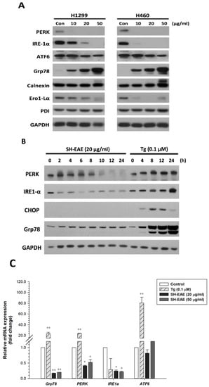 To examine more precisely the impact of SH-EAE on ER, we used immunofluorescence microscopy to study SH-EAE-treated NSCLC cells. The ER membrane of cells was labeled with ER-Tracker Red, a dye for selectively staining the potassium channels enriched in ER. Two classical ER stress inducers, tunicamycin (Tm) and thapsigargin (Tg), served as positive controls. When NSCLC cell lines H1299 and H460 were treated with SH-EAE at concentrations of 20 μg/mL, both cell lines showed massive vacuolization in the vicinity of the nucleus (Figure 3A,B). However, these results also suggest that vacuoles are likely derived from ER as the regions where cytoplasmic vacuoles were significantly overlapping with ER-Tracker Red signals. In contrast, little to no vacuole formation appeared in both H1299 and H460 cells treated with Tg or Tm. Their red fluorescent signals enable visualization of the typical structure of the ER, which originates from the nuclear envelope and radiates toward the periphery, similar to what was seen in control cells. To further check the relationship between SH-EAE-induced vacuoles and ER, we stained with specific markers for several organelles. Following treatment with SH-EAE, vacuoles observed using phase-contrast microscopy were selectively colocalized with the ER-Tracker Red, but not stained with the trackers for lysosomes or mitochondria (Figure 3C). Altogether, these results indicate that cytoplasmic vacuoles induced by SH-EAE might originate from the ER. The induction of ER stress resembles the phenotype called paraptosis [].