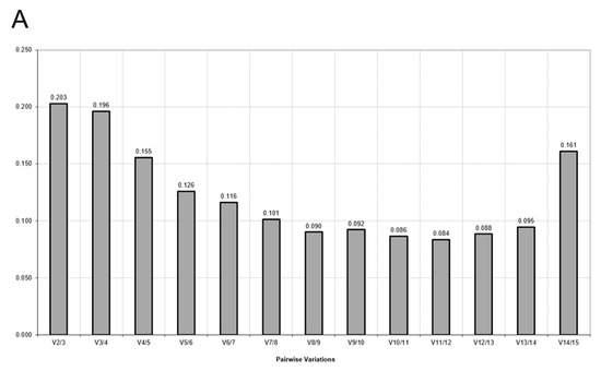 The stability of candidate HKG was analyzed through five different statistical methods of assessments: NormFinder [23], geNorm [24], BestKeeper [25], the ΔCt method [26], and the evaluation of coefficient of variation [20]. Moreover, we evaluated the minimal number of HKG required for the accurate normalization of RT-qPCR data by performing a pairwise variation (Vn/n+1) analysis by GeNorm between the normalization factors NFn and NFn+1. V values below the cutoff value 0.15 correspond to the optimal number of genes required for data normalization. The comprehensive ranking of the genes was also evaluated, giving a total of six evaluation methods. The net final rank of the most stable genes was obtained considering the lowest value of the geometric average of the rank obtained from all the algorithms and methods of stability calculation [20]. The smaller the geometric mean, the greater the stability of HKG expression.