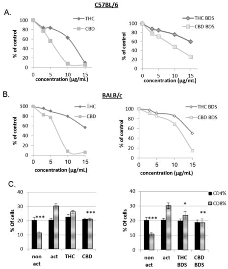 The effect of cannabis/cannabinoids on the proliferation of activated lymphocytes was analyzed. Succinimidyl ester (CFSE)-labeled C57BL/6 or BALB/c mouse splenocytes were activated with anti-CD3 antibodies for 4 days in the presence of pure cannabinoids, CBD BDS or THC BDS at various concentrations. Cell proliferation was assessed using CFSE FACS analysis. Interestingly, in vitro the inhibitory effect of pure cannabinoids on lymphocyte activation was stronger than that of cannabis extracts. Whether in the form of pure cannabinoids or cannabis extract, CBD inhibited proliferation significantly better than THC (Figure 1A,B and Figure S1A). The treatments, in the concentrations used, were not toxic to the cells (Figure S1B). Similar results were obtained using human Peripheral Blood Mononuclear Cells (PBMC) (Figure S1C). Upon anti-CD3 activation, the percentage of CD8 cells in the samples is elevated (Figure 1C). CBD, CBD BDS and, to a lesser extent, THC BDS treatments significantly inhibited this elevation.