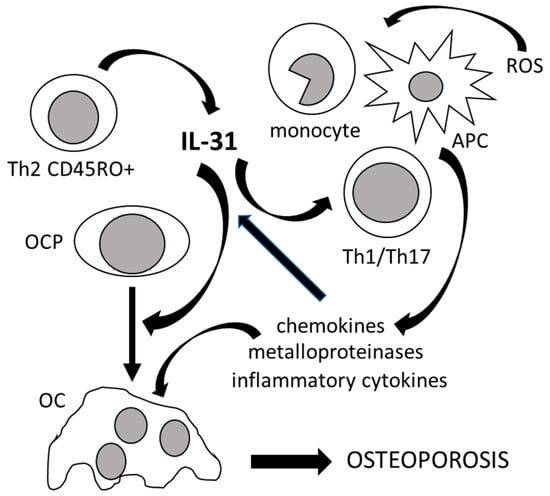 The role of IL-31 in bone remodeling. IL-31, mainly produced by T helper 2 memory cells (Th2 CD45RO+), promotes osteoclastogenesis by inducing the differentiation of osteoclast progenitors (OCP) into mature osteoclasts (OC). IL-31, in synergy with reactive oxygen species (ROS), also stimulates osteoclastogenesis indirectly by inducing antigen-presenting cells (APC), monocytes, and T helper 1 and 17 lymphocytes (Th1/Th17) to produce chemokines, metalloproteinases, and inflammatory cytokines, which in turn increase the production of IL-31. All of these events lead to the development of osteoporosis.