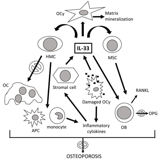 Release of alarmins or DAMPs (danger-associated molecular patterns), including IL-33, from damaged cells is a relevant mechanism by which immune cells can be alerted of tissue damage, and alarmins play a key role in the development of acute or chronic inflammatory diseases, cancer and osteoporosis [,]. The cell deaths of chondrocytes, osteoblasts, and osteocytes play important roles in skeletal development, repair, as well as in the pathogenesis of osteoporosis. Enhanced osteoclastogenesis induced by osteocyte death and autophagy through the release of alarmins has been described []. Osteocyte cell death and autophagy released DAMPs by binding to their receptors on macrophages, dendritic cells, monocytes, and neutrophils, promoting the production of proinflammatory cytokines including TNF-α, IL-6, and IL-1, which induce the expression of RANKL in osteoblasts. As a consequence, osteoclast precursors differentiate into mature osteoclasts through RANKL/RANK signaling, therefore leading to bone resorption but also to replacement of damaged bone [,]. Therefore, the dual-function alarmin IL-33 can either exert beneficial skeletal effects, leading to bone tissue repair, or provoke deleterious inflammation, leading to osteoporosis []. IL-33 acts at cellular, molecular, and transcriptional levels to mediate pluripotent functions in bone remodeling and has potential therapeutic value to mitigate osteoporosis [,,,,,].