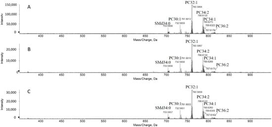 Representative mass spectra of lipids from human meibomian gland epithelial cells (HMGECs) acquired in positive ion mode. HMGECs were harvested by (A) 2:1 chloroform–methanol, (B) 10 mM ethylenediaminetetraacetic acid (EDTA), and (C) 0.25% trypsin–EDTA. Major peaks are identified. Labeling convention is carbon number in the acyl chains: double bond. Sphingomyelin with dihydroxy base (SMd), Phosphatidylcholine (PC).
