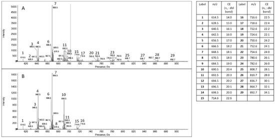 All samples were then diluted tenfold with methanol and ammonium acetate (final concentration = 2 mM). The sample was directly infused into a Triple TOF 5600 mass spectrometer (Sciex, Framingham, MA, USA) with electrospray ionization at a flow rate of 7 µL/min, as previously described []. MS and MS/MSall spectra were acquired in both positive and negative ion modes. MS/MSall analysis was performed with the SWATH technology (Sequential Window Acquisition of All Theoretical mass spectra, Sciex), where product ion MS/MS spectra for all precursor ions were acquired in the m/z range of interest (200 to 1200) at every one Dalton step with 6 min for each detection mode. The collision energy was 40 eV for positive ion mode and −54 eV for negative ion mode. The collision energy spread was 40 eV for both modes. At least four rinses were performed between sample runs, and results were monitored by mass spectrometry to ensure that carryover was negligible.
