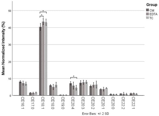 Comparison between the three harvesting techniques for the relative abundance of the cholesteryl esters (CEs) that were common (nc < 24) to both cell and media samples. There were no differences between the three techniques for 10 of the 12 CEs. The chloroform–methanol (CM) method yielded less CE18:1 than the EDTA and trypsin-containing (TC) methods but greater CE20:4 than the TC method. * p < 0.05, chloroform–methanol (CM), ethylenediaminetetraacetic acid (EDTA), trypsin-containing (TC) (trypsin–EDTA).