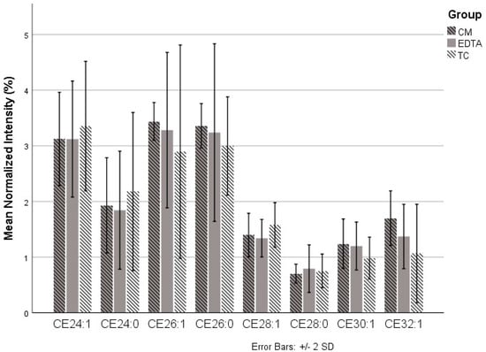 The relative abundance of each CE was compared between the three harvesting techniques, labeled as trypsin-containing (TC, 0.25% trypsin–EDTA), EDTA (10 mM EDTA), and chloroform–methanol (CM, 2:1 chloroform–methanol). No statistical differences were found between ten of the twelve CEs (Figure 3). The CM technique, however, yielded less CE18:1 (mean = 40.37) compared to EDTA (mean = 43.51, p = 0.02) and TC (mean = 43.14, p = 0.03) and greater CE20:4 (mean = 7.17) compared to TC (mean = 4.56, p = 0.02). There were no statistical differences between any of the longer-chain CEs (nc ≥ 24) among the three different harvesting techniques (Figure 4).