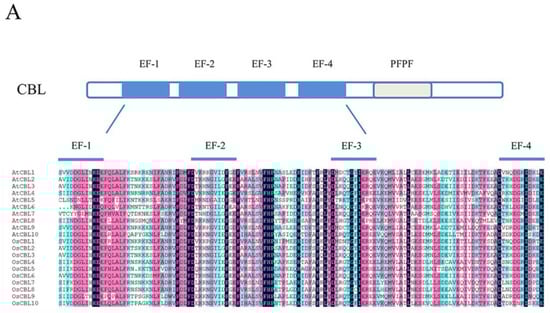 CBLs can be classified into three groups depending on the structure of the N-terminus []. The conserved structure of CBLs can influence their specific localizations and functions. CBLs in the first group harbor a relatively short N-terminal domain with a dual-lipid modification motif, such as AtCBL1, AtCBL4, AtCBL5, OsCBL5, OsCBL7, and OsCBL8 in Arabidopsis and rice, respectively. The second group possesses a tonoplast targeting sequence (TTS) in the N-terminal domain, comprising AtCBL2, AtCBL3, AtCBL6, AtCBL7, OsCBL2, OsCBL3, and OsCBL6 [,]. Compared with other CBLs, AtCBL10, OsCBL9, and OsCBL10 harbor a transmembrane helix that belongs to the third group [,,]. Meanwhile, the grouping accords with currently understood phylogenetic relationships (Figure 2B).