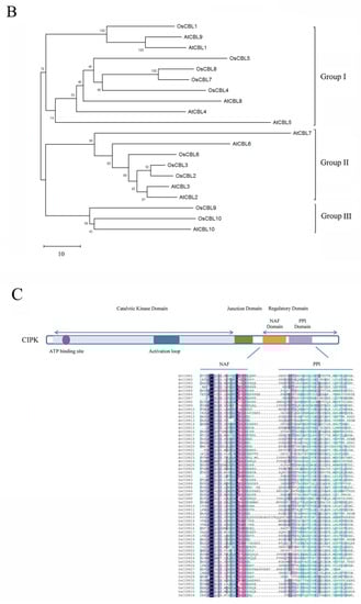 - Tripathi, V.; Parasuraman, B.; Laxmi, A.; Chattopadhyay, D. CIPK6, a CBL-interacting protein kinase is required for development and salt tolerance in plants. Plant J. 2009, 58, 778–790. [Google Scholar] [CrossRef]