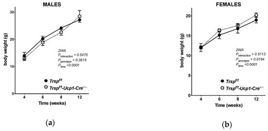 The phenotype observed in the Trspf/f-Ucp1-Cre+/− mice at room temperature led us to consider that the effects of Trsp loss in brown adipocytes might be revealed to a greater extent after activation of adaptive thermogenesis. Hence, we acutely exposed Trspf/f-Ucp1-Cre+/− and Trspf/f mice to 4 °C for 4 h. Both male and female Trspf/f-Ucp1-Cre+/− mice reduced their core body temperature at the same rate as corresponding controls (Figure 5). An interaction effect of genotype and time was observed in males (Figure 5a), but not in females (Figure 5b).