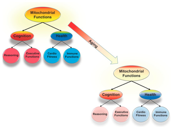 Mitochondrial functions provide a natural link between cognition, health, and aging []. One reason is the 105 mitochondria in the mammalian oocyte are randomly distributed among the cell lines that will form different physical systems []. Deleterious or salubrious mitochondrial DNA (mtDNA), as well as nuclear DNA (nDNA) that influence mitochondrial functioning, will be distributed throughout the body, creating the potential for similarities in the relative functioning of high-energy systems, such as the heart and brain. It is not that straightforward, however, as tissue-specific configurations of mitochondria eventually emerge, potentially related to tissue specific expression of nuclear genes that influence mitochondrial functioning [,]. Still, the initial pool of mitochondria and supporting mtDNA and nDNA will be highly similar across all physical systems and thus could easily contribute to a general fitness factor or body integrity [,,,]. The underlying mechanisms, including mitochondrial functioning, provide a ready link between health and brain and cognitive functioning.