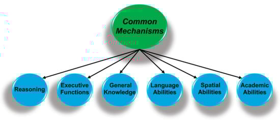 The key finding is that these second-order ability domains are positively correlated, such that individuals with higher performance on measures of executive functions also have above-average performance on reasoning tasks and have more general knowledge, in keeping with a mechanism or mechanisms common to all cognitive domains. There has been an active search for these mechanisms since Spearman’s 1904 publication [], and the associated proposals range from a mathematical artifact that emerges from statistical approaches for analyzing the relations among cognitive measures [,]; to basic cognitive processes, e.g., speed of processing fine-grain detail []; to systems of brain regions []; and to more fundamental biological process, e.g., control of oxidative stress [,].