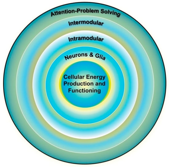 The cognitive abilities, such as attention-demanding problem solving, that show the most decline with cognitive aging [], and with age-related cognitive pathologies (e.g., Alzheimer’s disease) are supported by intermodular brain networks. These networks are hierarchal in organization, with the functioning of higher-level systems dependent on the integrity of lower-level systems, as shown in Figure 3 [,,]. In theory, the energy demands associated with the development, maintenance, and optimal functioning of these systems increase exponentially as one moves from lower (e.g., individual neurons) to higher (i.e., intermodular systems) network levels [].