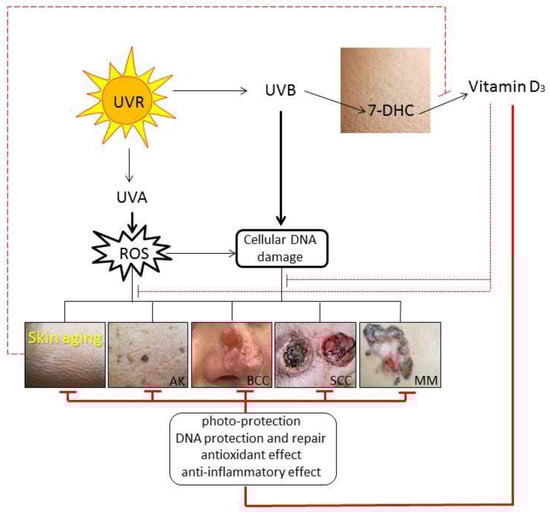 Excessive exposure to solar UVR accelerates skin aging and could trigger cutaneous cancerogenesis []. However, UVR plays a beneficial role in the regulation of many skin functions [,,]. The same UVB, responsible for the increase of non-melanoma skin cancer, is required for vitamin D3 production in the skin that supplies more than 90% of the vitamin D3 body’s requirement [,,]. In the skin, vitamin D3 is essential for the formation of the epidermal barrier and hair follicles, and its deficiency has been linked to many proliferative and inflammatory cutaneous disorders [,,,].