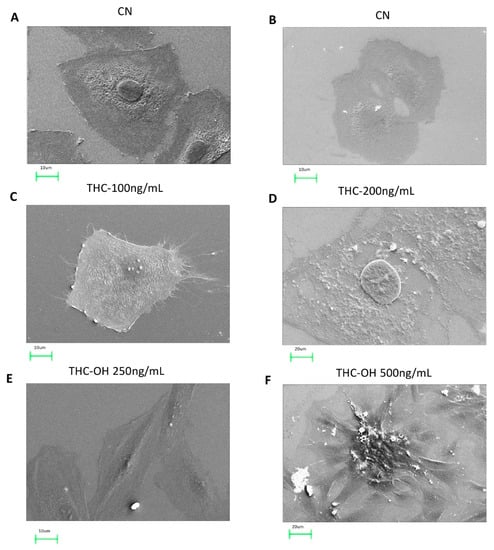 H9c2 cells were imaged using SEM to investigate if dose dependent cannabinoid treatments (THC 100/200 ng/mL THC-OH and THC-COOH 250/500 ng/mL) resulted in morphological alterations to cardiomyocytes. In response to THC treatment, there was no significant change in cell morphology compared to control (Figure 5A–D). Conversely, in response to low dose treatments with THC-OH and THC-COOH increased cell polarization occurred with pronounced stress fibre formation. Additionally, cells acquired a stellate shape concomitant with changes in cell adhesion; these morphological changes are consistent with early stages of increased cell motility (Figure 5E,G). High dose drug concentrations resulted in a deterioration of membrane integrity with perforations visible in response to THC-COOH and exacerbations in stress fibre formation in responses to high doses of THC-OH (Figure 5F,H). These results indicate that the level of polarization of cardiomyocytes is dose-dependent and more prominent in cells treated with THC-OH and THC-COOH.