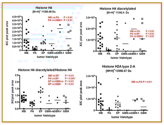 In summary, histone H4 diacetylation strongly characterized EP tumors. Likewise, the levels of histone H4 and histone H2A type 2-A were lower in PA with respect to all other histotypes and either distinguished MB or PA. The modifications of histones at their tails regulate gene expression and therefore different cellular processes. The acetylation/deacetylation processes of histones are involved in the regulation of DNA transcription and were found misbalanced in different cancer diseases and gliomas [,], and for that reason, they are now being explored for new pharmacological treatments [].