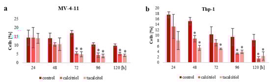 Calcitriol and tacalcitol increased the percentage of cells in the G1/G0 phase of the cell cycle. The changes were observed only in the MV-4-11, Thp-1, and HL-60 cell lines. These cell lines have been defined as sensitive to calcitriol and tacalcitol. In the case of the MV-4-11 cell line, an increase in cells in the G1/G0 phase was observed after 48 h, and this effect lingered until 120 h after calcitriol and tacalcitol use. At the same time, the population of cells in the S phase of the cell cycle decreased. The most significant reduction in the percentage of cells in the S phase was observed after 72 h, as compared to the control cells. There were no significant changes in the percentage of cells in the G2/M phase of the cell cycle (Figure 1a). A similar effect of an increase in the percentage of cells in the G1/G0 phase of the cell cycle was observed in the Thp-1 cell line. Ninety-six hours after using the tested compounds, an increase in the percentage of cells in the G1/G0 phase by about 20% compared to control cells was observed, with a simultaneous decrease in the number of cells in the S phase of the cell cycle. However, there were no significant changes in the percentage of cells in the G2/M phase of the cell cycle (Figure 1b).