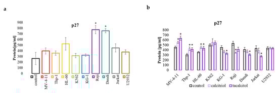 The basic level of p27 protein was significantly higher in the Raji and Daudi cells than PBMCs. However, the level of remaining cells was comparable to the control cells (Figure 4a). The use of calcitriol and tacalcitol resulted in an increased level of p27 in MV-4-11, HL-60, and Thp-1 cells. Conversely, calcitriol significantly reduced p27 in Raji and tacalcitol in KG-1, Daudi, and Jurkat cells (Figure 4b). miR-181a can impact the level of p21 protein by regulating the p53 protein, while miR-181b directly regulates the level of p27 [,]. It turned out that most cell lines have similar levels of the miR-181b molecule compared to PBMC. The exception was the HL-60 cell line, which had a much higher miR-181b than the control cells (Figure 4c). Interestingly, miR-181b decreased after using calcitriol and tacalcitol in three sensitive cell lines, MV-4-11, Thp-1, and HL-60. However, it increased in K562, Raji, Daudi, and Jurkat cells (Figure 4d). The miR-181a and p21 protein analysis did not show any correlation between the basal level and after treatment (Figure S3).