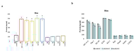 Programmed cell death or apoptosis occurs in response to developmental changes and disease states, and it is required to maintain a state of homeostasis in the body. Cell resistance to apoptosis is one of the hallmarks of cancer cells [,]. Proteins of the Bcl-2 family play a key role in regulating apoptosis and modulating death signaling through the internal or mitochondrial pathway []. While the Bcl-2 proteins and several close relatives promote cell survival, other family members, such as Bax and Bak, induce apoptosis. For example, the BH3 family members (Bim, Puma, Noxa, Bid, Bad, and Bik) induce apoptosis by activating the Bax and Bak proteins []. Interestingly, a low concentration of the Bim protein can activate Bak1. However, to obtain the same level of both proteins, a high concentration (µM) of the Bim protein is necessary []. In the conducted studies, the use of calcitriol and tacalcitol resulted in a decrease in the pro-apoptotic protein Bim and an increase in the amount of Bak1 protein. Therefore, examining the status of other pro-apoptotic BH3 proteins can explain the role in regulating Bak1 levels under the influence of calcitriol and tacalcitol.