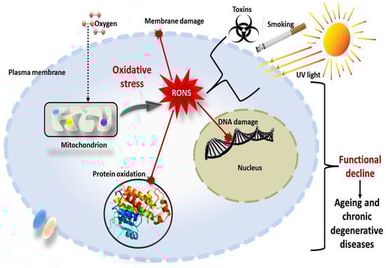 Globalisation, medical advances, technological developments, urbanisation, migration, and socioeconomic statuses in the 20th century have greatly influenced the global health status. Contrary to this, demographic projections in the 21st century suggest that age-related diseases pose a fundamental threat to the global health system and the health status of the elderly. The mechanism of ageing is complex and not fully understood. However, cumulative oxidative stress and chronic inflammation are the main features that have been theorised to play an essential role in age progression and chronic degenerative diseases []. Numerous normal cell metabolic processes in the human body (digesting food, breathing, alcohol and drug metabolism), besides genetic or environmental factors such as air pollutants, cigarette smoking, toxins, and radiation, generate toxic compounds called free radicals. Free radicals are oxygen-containing ions, molecules, or atoms with one or more unpaired electrons in the outermost orbit (valence shell) []. These molecular species are highly reactive, unstable, and capable of existing independently, thus, harmfully modifying deoxyribonucleic acid (DNA), proteins, and lipids and triggering several types of human diseases (Figure 1).