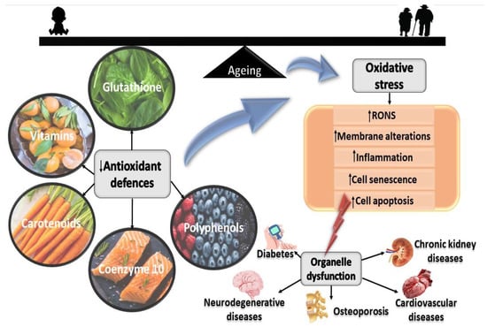 Inflammation signifies the innate immune system’s defensive and adaptative response against an injury and/or harmful objects (such as bacteria, viruses, and toxins) to re-establish homeostasis. The inflammatory cascade displays both the advancement and the evolution of the disease and stimulates disease progression. The apt regulation of the inflammatory cascade is crucial for avoiding damage to healthy cells. A dysregulated inflammatory response activates further inflammatory responses, which can cause sepsis and organ failure. Chronic inflammation can occur due to pro-inflammatory cytokine secretion, stimulated by senescent cells [,]. The phenomenon of low-grade chronic inflammation is characteristic of human ageing and is termed “inflammaging”. Consequently, the inflammatory cascade elevates extracellular ROS concentrations and oxidative stress. Elevated oxidative stress can result in the breakdown of the extracellular matrix (ECM) and activation of cell necrosis and apoptosis. The presence of necrotic cells and impaired ECM emits numerous constituents that over-activate the inflammatory pathway, resulting in a concatenation of events involving increased production of free radicals and oxidative stress [,].