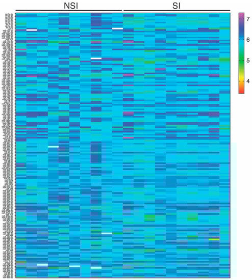 To evaluate miRNA expression levels and profiles of SI and NSI groups, an analysis of 179 miRNA species known to be present in human serum was performed using miRCURY LNA RT Kit (Qiagen, Hilden, Germany) for reverse transcription, miRCURY LNA SYBR Green PCR Kit (Qiagen) for quantitative real-time (qRT-PCR) amplification and Human Serum/Plasma Focus, miRCURY LNA miRNA Focus PCR panels (Quiagen, Hilden, Germany) according to the manufacturer’s instructions. Raw cycle threshold (Cq) values were inter-plate calibrated using UniSp3. Cqs above 35 cycles were censored at the minimum level observed for each miRNA. As housekeeping miRNA for data normalization, we selected the most stably expressed pair of miRNAs (miR-148a-3p and let-7b-5p) as determined by the Normfinder algorithm []. Accordingly, each single miRNA was normalized as ∆Cq = mean (CqmiR-148a-3p and let-7b-5p)—Cq miRNA. MiRNA levels were log-transformed before being used in the statistical analyses.