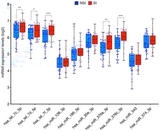To assess whether the plasma miRNAs were differentially expressed between the groups, we first conducted screen profiling of 179 circulating miRNAs commonly found in human plasma in ten SI and ten NSI age-matched patients (Figure 1). The established criteria for the selection of miRNA candidates were high expression levels (median Cq < 35 and detected in at least 80% of all samples) and statistical significance (p < 0.05). A total of 10 miRNAs, let-7c-5p, let-7d-5p, let-7f-5p, miR-128-3p, miR-186-5p, miR-30e-3p, miR-376a-3p, miR-376c-3p, miR-543 and miR-574-3p, were significantly expressed according to the selection criteria and selected for further analysis.