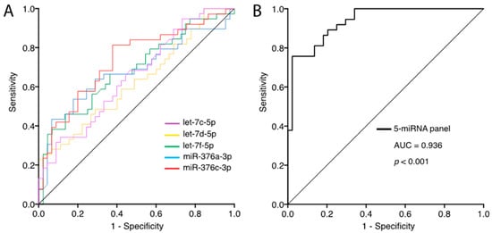 We assess the ability of the differentially expressed circulating miRNAs to distinguish between SI and NSI patients using the AUC-ROC. Figure 3A shows that miR-376c-3p achieved the highest AUC with a value of 0.736 (95% CI: 0.627–0.845; p < 0.001), indicating a moderate performance. Let-7c-5p, let-7d-5p, let-7f-5p and miR-376a-3p display AUC values of 0.652, 0.627, 0.688 and 0.682, respectively. Afterwards, we consider the diagnostic potential of the 5-miRNA set to differentiate between SI and NSI individuals. The AUC for the combination value of our miRNA panel (let-7c-5p, let-7d-5p, let-7f-5p, miR-376a-3p and miR-376c-3p) was 0.936 (95% CI: 0.887–0.985; p < 0.001) (Figure 3B), improving the diagnostic ability. The sensitivity, specificity and accuracy of each miRNA and the 5-miRNA panel are shown in Table 3.