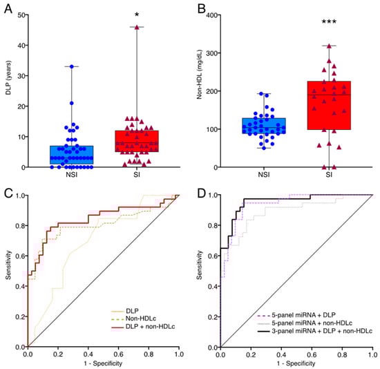 ROC curves for evaluating the predictive performance of clinical factors with differentially expressed miRNAs. (A) Box plot of DLP in NSI (n = 45) and SI (n = 39) subjects. (B) Box plot of non-HDLc levels in NSI (n = 45) and SI (n = 39) subjects. (C) ROC curves for each clinical parameter, DLP and non-HDLc, and for the association of DLP plus non-HDLc. (D) The ROC curve of the combined value of the 3-miRNA panel (let-7f-5p, miR-376a-3p and miR-376c-3p), DLP and non-HDLc plasmatic concentration. DLP: years of dyslipidemia SI: statin intolerant; NSI: non-statin intolerant; non-HDLc: non-high-density lipoprotein cholesterol. * p < 0.05; *** p < 0.005.