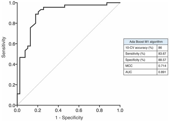 We investigated the potential value of the miRNA candidates to discriminate between the SI vs. the NSI cohort and their association with some clinical parameters. Only years of DLP and non-HDLc levels were significantly higher in SI patients (Figure 4A,B). We assess the potential of these two clinical parameters to distinguish between SI and NSI groups. The ROC curves of these factors, DLP and non-HDLc, showed AUC values of 0.700 and 0.807, respectively, indicating a moderate performance to discriminate SI from NSI patients, whereas the combination of these two parameters achieved an AUC value of 0.844 (Table 4). We developed a multivariate model to increase the diagnostic power to discriminate between SI vs. NSI combining differentially expressed miRNAs, DLP and/or non-HDLc plasmatic levels. The diagnostic performance of the 5-miRNA panel was only slightly improved with DLP as, although the AUC value was similar, this model achieved an accuracy of 84.81% against the 82.72% shown by the 5-miRNA panel (Figure 4C,D). In contrast, the diagnostic ability of the 5-miRNA set and the non-HDLc concentration was lower than that of the 5-miRNA panel by itself, showing an AUC value of 0.855. Interestingly, the combination of the 3-miRNA panel composed of let-7f, miR-376a-3p and miR-376c-3p, and DLP plus non-HDLc reached the highest diagnostic performance with an AUC value of 0.954 and an accuracy of 89.47% (Figure 4D and Table 4). We next use the Weka data mining tool to evaluate the performance of our model using 10-fold cross-validation. We ran all classifiers in Weka and, the most successful algorithm was Ada Boost M1 achieving a mean training accuracy, sensitivity, specificity, MCC and AUC of 86%, 83.67%, 88.57%, 0.714 and 0.891, respectively, keeping higher diagnostic value than the 5-miRNA panel model (Figure 5).
