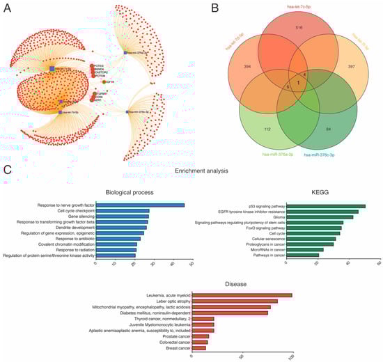 We next investigated the biological significance of the five differentially expressed miRNAs using GO enrichment and KEGG pathway analysis. We used the miRNet online software (https://www.mirnet.ca, accessed on 9 November 2021) to predict the putative targets of let-7c-5p, let-7d-5p, let-7f-5p, miR-376a-3p and miR-376c-3p. The let-7c-5p, let-7d-5p, let-7f-5p, miR-376a-3p and miR-376c-3p were associated with 516, 394, 397,112 and 84 mRNAs in the miRNet database, respectively. Interestingly, one mRNA target, IGF1R, was shared by these five miRNAs (Figure 6A,B). GO analysis using the WebGesalt (WEB-based Gene Set Analysis Toolkit) computational tool showed significant enrichment of biological processes related to response to nerve growth factor and dendrite development, cell cycle, gene silencing and response to transforming growth factor-beta (TGF-ß), among others (Figure 6, left panel). KEGG pathway analysis showed several pathways, the most significant of which are the p53 signaling pathway, Forkhead members of the O class (FoxO) signaling pathway [,], EGFR tyrosine kinase inhibitor resistance, and glioma (Figure 6C, right panel). Finally, disease enrichment analysis identified that these five miRNAs might be involved in leukemia, mitochondrial myopathy, lactic acidosis and diabetes mellitus (noninsulin-dependent), among others (Figure 6C, bottom panel).