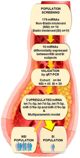 MicroRNAs (miRNAs) are small non-coding RNAs identified as important regulators of genes involved in several biological processes [,,]. miRNAs regulate gene expression by degrading messenger RNAs (mRNAs), repressing protein synthesis, or interacting with long non-coding RNAs. Their properties make them the most widely studied extracellular RNAs as diagnostic and therapeutic-tailored markers in the cardiovascular field [,,]. Several studies have described the relationship between statins and miRNA profiles [,,,], but this is the first time miRNAs have been considered as an alternative diagnostic tool related to statin intolerance detection. Therefore, we aim to determine the role of miRNA as a peripheral biomarker to identify the statin intolerant (SI) population and thus personalize dyslipidemia treatment in these patients at cardiovascular risk.