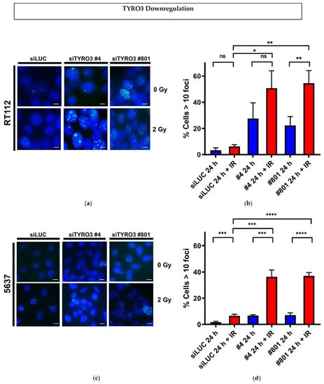 To decipher the mechanisms underlying the observed impact of the modulation of TYRO3 expression on the radiosensitivity of BCa, we studied the γH2AX foci formation and repair by immunofluorescence staining after TYRO3 upregulation in UM-UC-3 cells or downregulation in both RT112 and 5637 cells combined with radiation treatment. We analysed both foci at 30 min (where the foci formation is maximum) (Supplementary Figure S3) and 24 h after irradiation (residual foci) (Figure 2a–f). 30 min after irradiation, in both cell lines, TYRO3 downregulated cells induced an increase in these foci. We noticed also in RT112 and to a lesser extent in 5637 cells, that even in absence of radiation both siTYRO3 #4 and #801 induced γH2AX foci as soon as 48 h post-transfection (in blue, 30 min after IR in the Supplementary Figure S3). This effect was persistent during the following 24h (Figure 2a,c). We then analysed the residual foci 24 h after irradiation and observed an increased number of residual foci in both TYRO3 downregulated cell lines (Figure 2b,d). Indeed, between 36 to 37% of cells for 5637, and 50 to 54% of cells for RT112 still had more than 10 foci/nucleus after 24 h of 2 Gy irradiation in the combined treatment, whereas for the siLUC-transfected cells without radiation, almost all the induced DNA foci had been repaired 24 h after irradiation and only 5–9% of cells were still having more than 10 foci/nucleus (Figure 2b,d). Conversely, TYRO3 overexpression in UM-UC-3 cells did not impact the formation of initial foci but resulted in a significant decrease in number of residual foci when compared to the CTRL (23 vs. 39%, respectively) 24 h after 6 Gy radiation (Figure 2e,f).