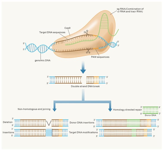 After more than 20 years of research, the CRISPR/Cas9 mechanism of action is relatively clear. In the CRISPR/Cas9 system, tracrRNA and crRNA combine to form a complex that recruits and guides Cas9 to cut the DNA sequence at a specific genomic location. Researchers went a step further and converted the tracrRNA and crRNA complex into sgRNA, which consists of only one RNA strand. Guided by sgRNA, the Cas protein recognizes a conserved sequence [,]. Specifically, it recognizes and binds to the protospacer adjacent motif (PAM) and unwinds the double-stranded DNA. The crRNA is a complementary sequence and pairs with the target sequence upstream of the PAM. The crRNA and tracrRNA, which are mature products derived from the CRISPR locus, form a sgRNA through base complementation and pairing. The sgRNA is paired with the sequence upstream of the PAM, resulting in a DSB []. The DSBs are repaired by non-homologous end joining (NHEJ) or homology-directed repair (HDR). The NHEJ repair method is prone to errors, with small fragments deleted or inserted at the break site, resulting in gene mutations. In the presence of donor DNA, the break site is repaired via HDR, which precisely inserts or replaces bases (Figure 2) [,,].