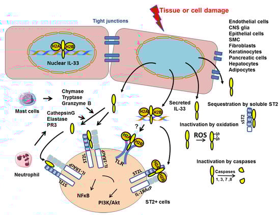 The IL-33 protein comprises two domains: the C-terminal domain containing IL-1 family member homology and mediating the extracellular, ST2-dependent effects of IL-33 [], and the N-terminal domain targeting IL-33 to the nucleus where it binds to chromatin at the surface of the nucleosome by docking to the pockets of histone H2A–H2B dimer (Figure 1) []. Although this binding has been shown to confer a potent transcriptional repressor capacity in an artificial gene reporter assay [], it has been reported that the nuclear IL-33 has no influence on the global transcriptome or proteome of cultured human epithelial or endothelial cells, respectively [,]. In fact, the nuclear restriction and heterochromatin enrichment of IL-33 are post-translational mechanisms that regulate the release from necrotic cells and ST2-mediated bioactivity of IL-33 (Figure 1) []. It is now clear that chromatin components or nucleosomes are important damage-associated molecular pattern (DAMPs) that induce proinflammatory signaling when released into the extracellular environment []. Interestingly, Luzina I.G. et al., demonstrated that full-length IL-33 (FL-IL-33), in contrast to the mature form (mIL-33), is functionally active in vivo in an ST2-independent fashion []. The FL-IL-33 intratracheally instilled in mice induced inflammatory cells’ infiltration in their lungs independently of ST2, whereas mIL-33 required ST2 to induce Th2-associated effects. Detailed mechanistic explanations for the ST2-independent effects of FL-IL-33 will require further analysis but we propose that FL-IL-33 complexed with chromatin could act as DAMPs and activate Toll-like-receptors (TLRs) (Figure 1).