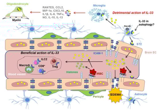 Mechanistic insights on the cellular and molecular players involved in the effect of IL-33/ST2 pathway, following the sequestration of iRBC in the vasculature of the BBB. IRBCs bind to ICAM-1 at the surface of endothelial cells via the Plasmodium erythrocyte membrane protein 1 (PfEMP1). IRBCs may also release IL-33 (yellow circles) that can activate ICAM-1 expression on EC promoting the binding of iRBC. Histones (green circles) released by iRBC may synergize with IL-33. IL-33 drives the expansion of ILC2 cells, leading to the polarization of the anti-inflammatory M2 macrophages, which in turn expand Tregs giving a beneficial role of the IL-33/ST2 pathway in ECM. IL-33 may also have detrimental activities by inducing vascular permeablity responsible for œdema and targeting cells involved in the integrity of BBB, such as microglia which can then produce IL-1β resulting in neuroinflammation and IL-33 overexpression in oligodendrocytes. Autophagy pathways participate in the neuropathophysiological mechanisms of CM in driving the transfer of PbA-microvesicles (PbA-MVs-grey circle) and the induction the proinflammatory response in astrocytes. This pathway could also involve the IL-33/ST2 activity.