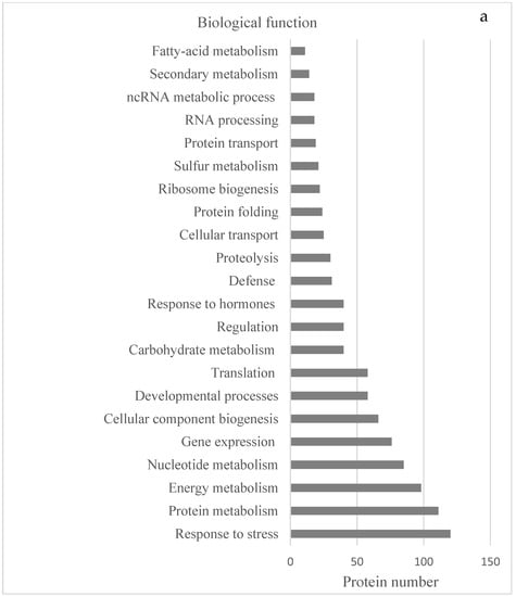 To obtain better insights into the function of both collections of proteins, Gene Ontology (GO) classification analyses provided by the STRING platform were performed. The set of 417 proteins were checked according to the standard categories ‘biological function’, ‘molecular function’, and ‘cellular component’. In the category ‘biological processes’ (Figure 1a), the largest number of proteins shared by both species have a function in response to stress (about 25%). In addition, there were abundant proteins involved in the primary metabolism of amino acids, peptides, proteins (including folding, transport, and proteolysis), and nucleic acids. Several proteins involved in nitrogen and sulfur metabolism, ribosome biogenesis, gene expression, and translation were also included. We also found a large group of proteins that are involved in the generation of precursor metabolites, energy, and photosynthesis, as well as others involved in plant developmental processes. A smaller number of proteins is associated with translation, transport, toxin catabolism, and chaperone-mediated protein folding.
