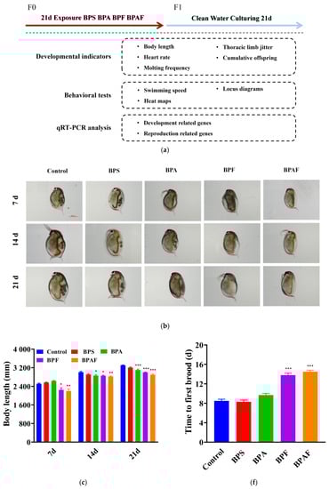 A schematic of the experimental design used (a). Development and reproduction of the F0 gener-ation induced by BPs: D. magna with microscopic observation (b), body length (c), heart rate (d), thoracic limb jittering (e), time to first brood (f), cumulative offspring (g), and molting frequency (h). Asterisks indicate significant differences between exposed and control groups (* p < 0.05, ** p < 0.01, *** p < 0.001).