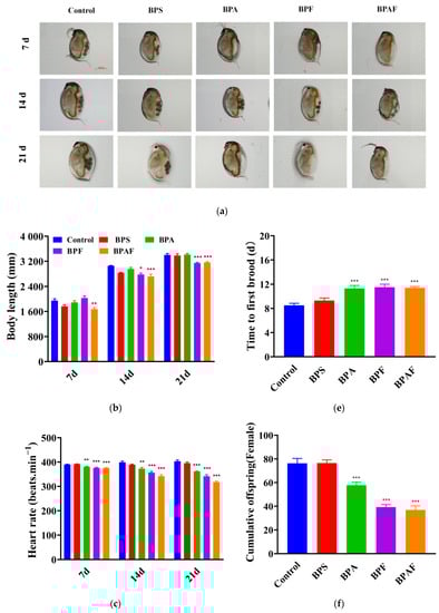 Body length can reflect the developmental situation at some levels. Our study showed that, compared with the control group, the body length in the exposed group was reduced, especially in the BPF and BPAF groups, and this inhibition became clearer over time. Heart rate and thoracic limb jittering are linked to feeding behavior or respiratory metabolism, indicating the health and growth of organisms and the stress response to pollutants [33]. Both were significantly decreased in the F0 and F1 generations after BPA, BPF, and BPAF treatment, whereas there was no significant difference in the group exposed to BPS. The thoracic limb is the food-intake organ of D. magna, and alterations in the thoracic limb may result in feeding difficulties. It is possible that the depression of heart rate led to a decrease in thoracic limb frequency or that BPAF affected the nervous system [34,35].