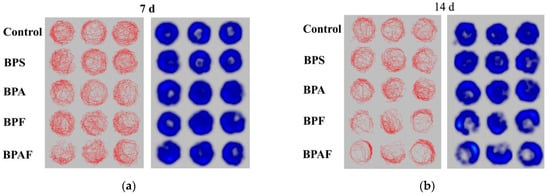 The behavioral response of the F0 generation is shown in Figure 3. As shown in Figure 3a–c, D. magna tended to be static in the treatment group, especially in the BPF and BPAF treatment groups, after 21 d of exposure. After 7 d of exposure, there was no significant difference in swimming speed between the control and exposed groups. The swimming speeds of D. magna treated with BPS, BPA, BPF, and BPAF were 1%, 9%, 22% (p < 0.05), and 36% (p < 0.01) of the control group, respectively, after 14 d of exposure and 1%, 20% (p < 0.001), 31% (p < 0.001), and 33% (p < 0.001) after 21 d (Figure 3d).
