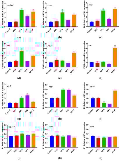 Expression of genes related to development (a–f,j–o) and reproduction (g–i) in the F0 generation (a–i) and F1 generation (j–o). Asterisks indicate significant differences between the exposed and control groups (* p < 0.05, ** p < 0.01, *** p < 0.001).