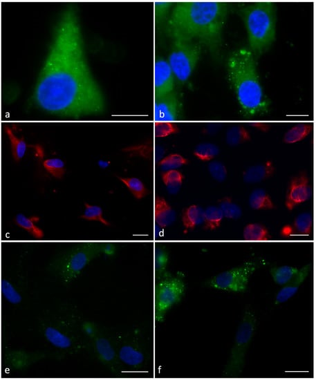 The Phospho-AMPKα labelling was brighter in SCs treated with cationic and anionic liposomes that showed the presence of numerous spots in the cytoplasm (Figure 2e, 40% of the cells) compared to controls and cells incubated with zwitterionic liposomes (Figure 2f).