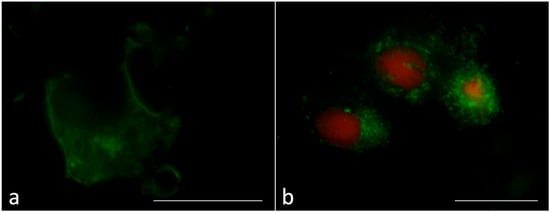 The distribution of β-actin appeared uniform from the nucleus to the plasma membrane (Figure 2a) after incubation with zwitterionic liposomes. (Figure 2a) showed that SCs incubated with cationic and anionic liposomes highlighted very intense spots in the cytoplasm at a percentage of 35% and 25% of examined cells, respectively (Figure 2b).