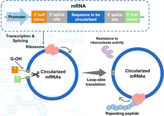 One smart strategy that avoids the use of long and repetitive DNA is repetitive protein translation from circular mRNA (cmRNA). cmRNAs are cyclized, single-stranded RNA derived from back-splicing of precursor mRNAs. A cmRNA can be generated by fusion of a self-splicing intron (e.g., the td gene from T4 phage) to a mRNA that encodes the target protein [,]. Once transcribed, the self-splicing intron catalyzes a spontaneous splicing–ligation reaction to form cmRNA that contains a stop-codon-free coding RNA (Figure 2). During translation, a ribosome translates through the cmRNA rounds and rounds until it disengages from the cmRNA template, producing repetitive proteins.