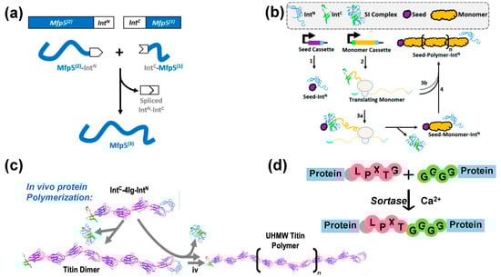 Different strategies for ligation of protein backbones via a peptide bond. (a) SI-mediated one-step protein–protein ligation of the mussel foot protein Mfp5 []. Copyright 2018, American Chemical Society. (b) SI-mediated chain growth protein polymerization []. Copyright 2019, American Chemical Society. (c) SI-mediated protein polymerization of titin Ig 67–70 []. Copyright 2021, Nature Publishing Group. (d) Sortase-mediated protein ligation reaction.