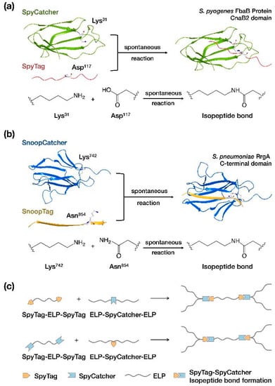 The spontaneous isopeptide bond formation by different Catcher/Tag reactions. (a) SpyTag–SpyCatcher (PDB entry: 4MLI) and (b) SnoopTag–SnoopCatcher (PDB entry: 2WW8). (c) An illustration of applying the SpyCatcher–SpyTag reaction into HMW highly repetitive protein creation [].