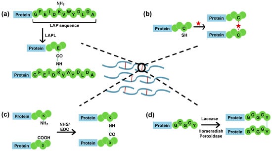 Various protein crosslinking strategies using side-chain chemistry. (a) Lipoic acid protein ligase mediated crosslinking that targets the LAP sequence for formation of an intermolecular amide bond. (b) Cysteine-specific conjugation using homobifunctional linkers such as maleimide (marked with red star in figure). (c) Lysine-specific crosslinking catalyzed by 1-ethyl-3-(3-dimethylaminopropyl)-carbodiimide (EDC) and N-hydroxysuccinimide (NHS). (d) Tyrosine-specific crosslinking using enzymes such as laccase and horseradish peroxidase for the oxidation of phenol side chains.