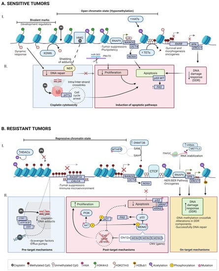 Genomic and epigenomic landscape of chemoresponse in TGCT. Proposed mechanisms that mediate sensitivity and resistance to cisplatin. (A) Sensitive tumors. (AI). Some key players that lead to cisplatin sensitivity are DNA hypomethylation, chromatin-activation marks and increased expression of pluripotency genes, as well as the crosstalk among low expression levels and promoter methylation of oncogenes. (AII). Intrinsic hypersensitivity is mediated by downstream regulation of DDR mechanisms induced by cisplatin, together with an open chromatin state promoting DNA–cisplatin adduct accumulation and cell cycle arrest, thus inducing cell death mediated by apoptotic pathways (mainly p53). (B) Resistant tumors. (BI). Some factors that contribute to cisplatin resistance are DNA hypermethylation, chromatin-repressive marks, increased expression of DDR factors, and decreased expression in pluripotency genes. (BII). Mechanisms of resistance to cisplatin are categorized into pre-target, on-target, and post-target.