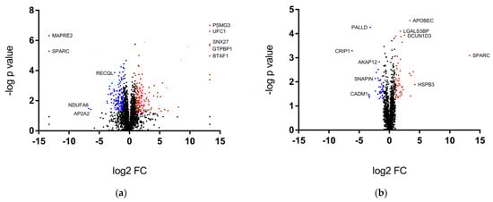 In order to analyze the protein expression changes between chemoresistant and wild-type cells upon FOLFOX treatment, we employed high-throughput MS proteomics analysis. MS analysis identified a total of 2759 (DLD1-R and DLD1) and 2764 (HCT116-R and HCT116) proteins. Among the identified proteins, there were 309 differentially expressed proteins (DEPs) between DLD1-R and DLD1 (−1 ≤ Log2 FC ≥ 1, p < 0.05). Of these, 153 and 156 proteins were up- (labeled as red) and down-regulated (labeled as blue), respectively (Figure 2a, Table S1). On the other hand, 90 proteins were DEPs between HCT116-R and HCT116 (−1 ≤ Log2 FC ≥ 1, p < 0.05), of which 49 and 41 proteins were up-regulated (labeled as red) and down-regulated (labeled as blue), respectively (Figure 2b, Table S2). The overall expression patterns among groups were displayed in a heat map (Figure 2c,d).