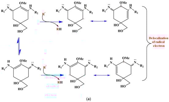 ROS scavenging mechanism of iminocyclohexene-type MAAs by resonance of radical electron at C4 and C6 position: (a) basic environment; (b) acidic environment (adapted from Wada et al. []).